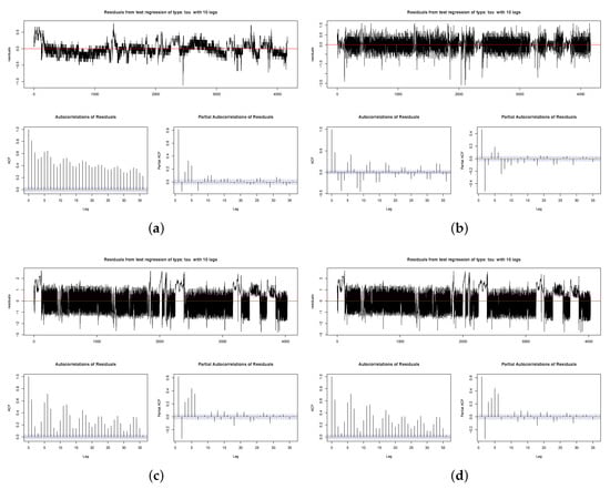 Signal, autocorrelations and partial autocorrelations of residuals: (a) TAR sensor. (b) TAS sensor. (c) TFEU sensor. (d) TFSU sensor.