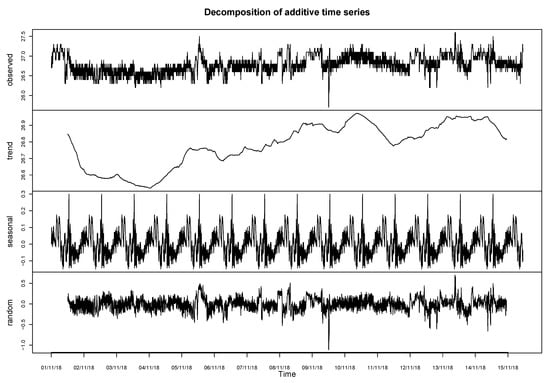A similar approach to this work, related to the analysis of temperature data sensor, was done by Bhandari et al. []. They modeled the temperature phenomenon as a stochastic process and analyzed it using a time series modeling framework. The time series modeling approach selected was the autoregressive, integrated, moving average (ARIMA) model, which determines how the short-term predictability of future temperature is affected by sampling interval and extrapolation technique. The ARIMA models are used to forecast the remaining days of data. For each sampling rate, the ARIMA model is trained on three days of data, and then is capable of predicting up to two hours forward from that point.