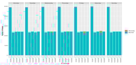 One of the features that provides a wealth of information in traffic analysis is the number of packets sent by each IP address source. This information allows one to gain an insight into the distribution of the packets over the network and predicts its behavior. The number of packets sent from every source IP over the days is shown in Figure 7. Every IP address represents an InRow, that is, the packets presented are the sum of the packets sent by the four sensors.