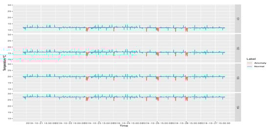 The MQTT payloads are extracted and grouped according to the clientId to recreate a time series and to be able to visualize the temperature signal presented by the sensors in the dataset. Figure 8 shows the sensor signal pf both normal and abnormal traffic, over the seven days as a time function.