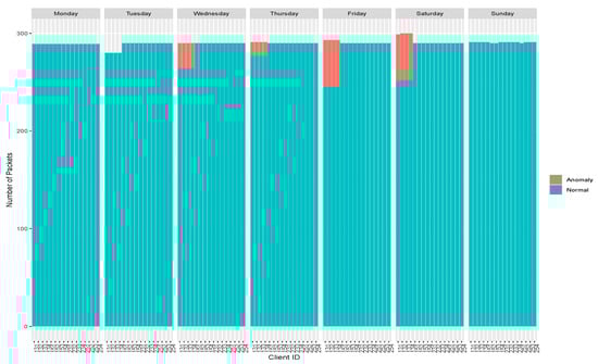 As we know, the total traffic distribution packets are uniform, so we expect the same behavior from clientId packets under normal conditions. The number of packets sent by day by clientId is shown in Figure 9. As mentioned above, a first instance to detect unlabeled anomalies is the lack of uniformity in traffic. This means that interception anomaly are detected through the absence of packets on Tuesday. As mentioned before, some missing Sunday packages correspond to the connection closures that are presented the next day.