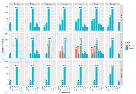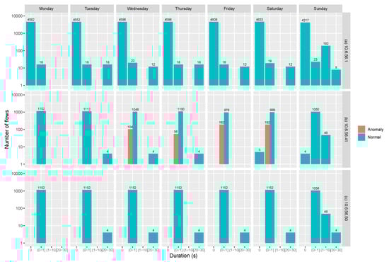 The presence of flows with a duration greater than 5 min is evidence of flows corresponding to this type of abnormally, as is shown in Figure 11. According to this, the interception anomaly is done on Tuesday, Friday and Saturday as expected. This feature allows us to label all those flows that correspond to this kind of abnormal behavior.
