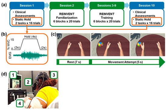 Each participant visited the lab for ten sessions (1–2 h each) over the course of two weeks. An outline of the study elements is shown in Figure 1, with each element detailed further below. Briefly, in sessions 1 and 10, we performed clinical assessments of upper limb function, grip strength, and wrist mobility (Figure 1a). We also performed an assessment of muscle control (static hold), in which participants used feedback of their wrist EMG amplitude from flexors and extensors (separately) to match a target level of activation for 16 trials of 4 s each (Figure 1b). During this test, we also recorded EEG over the ipsilesional and contralesional motor cortices to evaluate corticomuscular coherence. During session 2, participants were familiarized with our VR wrist-extensor training system. During sessions 3–9, the training intervention was provided for 1 h each.
