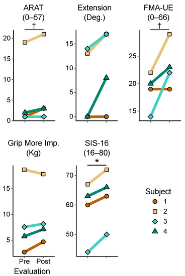 At the group level, only the SIS-16 showed significant improvements (t = 5.67, p = 0.011; Figure 2). We found non-significant trends in that ARAT (t = 2.61, p = 0.079) and FMA-UE (t = 2.43, p = 0.093). The range of active wrist extension improved for three participants, but the effect was quite variable across individuals (t = 2.27, p = 0.108). In addition, three participants that improved their FMA score, with two (participants 2 and 3) showing an improvement meeting the minimal clinically important difference (MCID) criteria of 4.25–7.25 points [65]. None of the other measures showed significant group level changes, as shown in Table 2.