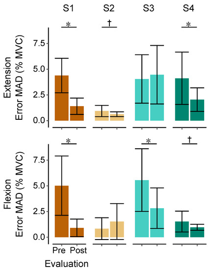 Performance changes in EMG amplitude control. Individual changes (1–4, left to right) in tracking performance (median absolute deviation (MAD) error) during maintenance of a constant level of extensor (top) or flexor (bottom) activity before and after seven sessions of wrist extensor training. Note that the training itself did not require maintenance of a constant level of EMG, nor was direct EMG feedback provided. Improvements were seen in both tasks after training. * indicates a significant change at the 95% confidence level. † indicates a nonsignificant trend at p < 0.1. Bar heights display the mean error and error bars display +/−1 standard deviation.