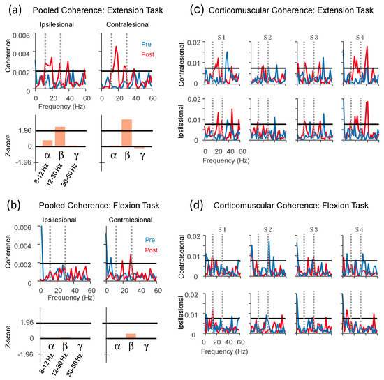 Corticomuscular coherence during tracking: We evaluated changes in corticomuscular coherence at the group level, with a Z-score difference of coherence [58] (pre versus post) at each frequency of the group-level coherence profiles constructed for each task (flexion or extension) and hemisphere (ipsilesional and contralesional) using the formula given in Equation (3):