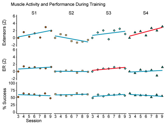 Muscle activity and performance during training. Each of the four columns represents the per-session average of one measure (rows) recorded during training. Top row: extensor EMG activity, normalized to the first session (Z-score). Middle row: extensor ratio (ER), or ratio of extensor activation relative to total muscle activity, also normalized to the first session. Bottom row: game performance as the percentage of trials in which participants exceeded the ER threshold, as well as a minimal activation threshold set to 30% of maximal wrist extension. Best fit lines are included to visualize trends across sessions. Red lines indicate that a Spearman rank correlation calculated between session number and the measure of interest, for that participant, exceeded the 95% confidence threshold.