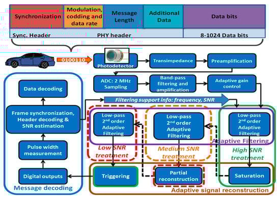 Considering the dynamics and the unpredictability of the automotive VLC channel and the benefits that could be provided by an environment-adaptive capability [], this section introduces such a VLC receiver architecture. The proposed VLC receiver is capable to evaluate the SNR of the received data signal and based on this estimation, to reconfigure its signal processing plan, with the purpose of ensuring an optimally-balanced signal treatment.