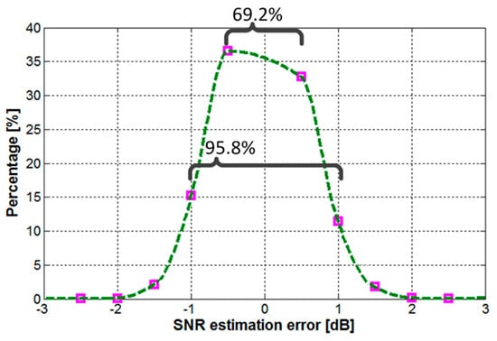 The next section presents the simulation results confirming the performances of the proposed SNR-adaptive VLC receiver architecture. The parameters used for these simulations are summarized in Table 1. As the reconfigurable computing process is based on the SNR estimation, the first simulations were intended to evaluate the accuracy of the SNR assessment. The results of SNR estimation error for 104 messages data sets are illustrated in Figure 3. One can see that in 96% of the cases, the estimation error is below 1 dB, whereas in 70%, the estimation error is below 0.5 dB, confirming the validity of the SNR approximation. The percentage estimation error has an asymmetric Gaussian distribution, slighted orientated toward the negative direction. This is because the SNR estimation algorithm was implemented with the intention to slightly diminish the estimated SNR, in order to reduce the chances that a message is treated using a suboptimal signal processing configuration. Even so, one can see that there are a limited number of messages for which the SNR estimation block considers that the SNR is higher than its real value.