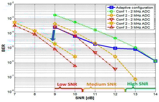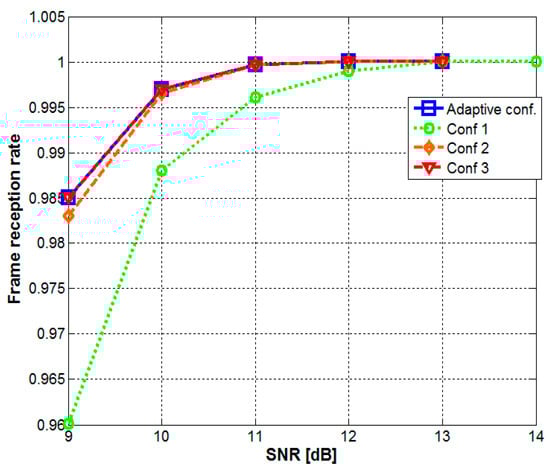 After the validation of the SNR-estimation algorithm, the next simulations were aimed to investigate the performances of the three individual configurations (with no adaptive character) and to establish the SNR thresholds separating them when they are used in the SNR-adaptive configuration. Thus, assuming that a specific application requires a BER lower than 10−4 (e.g., a BER < 10−3 is required for the proper transmission of voice messages), but it has no extra benefits if the BER is lower than 10−5, a SNR bellow 10.5 dB was considered low (requires intensive signal treatment), whereas if it is above 12.5 dB, it is considered high (requires minimum signal treatment). With the thresholds established, the SNR-adaptive configuration was tested, in order to determine the frame reception rate and the BER. The simulations results for the frame reception rate and for the BER are presented in Figure 4, respectively in Figure 5. Due to the large data set used in these simulations, the confidence level of the results is of 99%. The results confirm the SNR-adaptive character and the optimally balanced behavior.