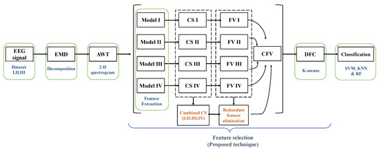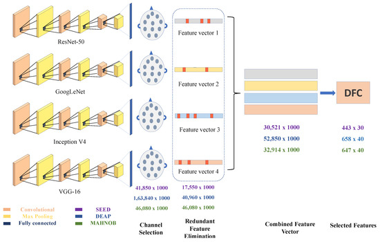 In recent years, much importance has been given to the recognition of human emotions using Electroencephalographic (EEG) signals. The Brain–Computer Interface (BCI), in Affective Computing, can be effectively used to control the devices with EEG signals [1]. With the development of machine learning tools, human emotions can be perceived more effectively using Neural Networks (NNs) compared to traditional handcrafted emotion recognition methods [2]. The task of identifying human emotions using EEG signals is still difficult due to the low temporal boundaries and the non-linear nature of the EEG signals, and different participants behave differently in the same scenario. In addition to neural networks, BCI provides a better approach to detect EEG signals for emotion classification [3]. EEG information is collected from the human skull using bio-amplifiers or electrodes. The more electrodes, the more useful information can be captured, while one electrode represents one EEG channel. Non-linear EEG signals for any subject and different channel numbers can have a dimensional curse to recognize a single emotion. To avoid the dimensionality issue and computational overhead, one should only select features that currently represent the user’s emotional state. To this end, much attention has been paid to recognizing emotions by converting one-dimensional EEG signals into two-dimensional spectral images. The spectral representation of the EEG signal contains information about time and frequency components. Feature selection is the process of selecting the most relevant features that efficiently predict system output and avoid dimensional curses. In emotion recognition and EEG-based classification, it is imperative to choose high-quality features because of computational overhead. In this article, we suggest a bidirectional feature selection method to save computational overhead using combined features of multiple neural networks. With the many advances in machine learning in recent years, high-quality features have been chosen using many traditional feature selection methods [4,5,6]. Since the EEG signal is non-linear, it is difficult to find high-quality feature properties due to its characteristics, accurately. The authors in [4] refer to a concept that the accuracy of classification may be reduced by adding more features to the learning algorithm after some time.