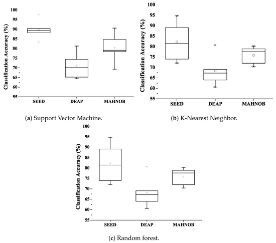 - Reduced feature vectors are classified for selected channels and features. For comparison, the accuracy of all channels and individual models is also verified on these datasets through classification performance. In the three datasets, the participants’ different emotional states are classified using all kernels of Support Vector Machine (SVM), k-Nearest Neighbors (k-NN) and Random Forest (RF) classifiers.