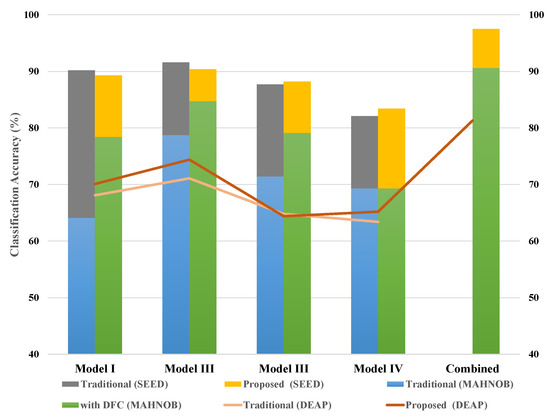 Second, classify the proposed model using the k-NN classifier. The k-NN classification classifies objects based on the values of the nearest neighbour function. It calculates the distance of each attribute value from each class. This algorithm uses the Euclidean distance method to find the nearest neighbour. Classification performance was achieved with a fine kernel. Best classification accuracy of 92.3% was achieved in the SEED dataset and 78.9% and 77.3%, respectively, in the DEAP and MAHNOB datasets. Figure 4b shows the performance statistics of k-NN using the combined DFC and individual models.