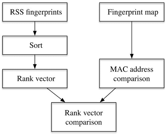 where and denote the two RSS fingerprints in matching. In Reference [], the authors provide a comprehensive review of 49 different metrics adopted in WiFi based fingerprinting. Different metrics may have different features as shown in Reference [], for example, the Euclidean distance has the best performance if two measurement points are close to each other; the Jaccard distance can achieve coarse estimation; however, it is sensitive to points far away from each other; the Spearman’s footrule performs especially well in the middle range. These metrics can be roughly categorized into—RSS value-based and rank-based. In the RSS value-based metrics, the RSS values are adopted while in rank-based metrics, only the relative magnitude information is adopted with information loss, which results in a faster calculation. Figure 1 gives the process for calculating rank based distance, where rank vector is generated according to the sorting values of the RSS values (from strongest to weakest). Then the ranks are assigned to the corresponding APs, whose identity is represented as their Media Access Control (MAC) address. Then in the online positioning process, the sorted rank vector can be compared with the vectors sorted in the fingerprint map.