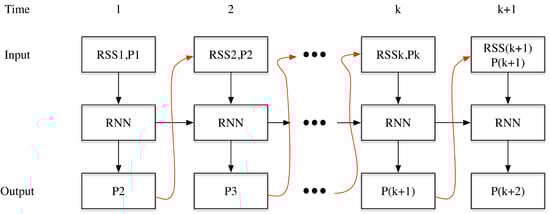 Figure 2. The Recurrent Neural Network (RNN) implementation for WiFi based fingerprinting in Reference [], where the sequences of the fingerprints along with the positions are the input, and the sequences of the positions are the output.