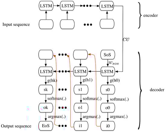 Figure 4 shows the detailed information of the encoder and the decoder. In the encoder, the words represented by vectors (see word embedding in Reference []) are input to the LSTM cells. The stacked cell can output a context vector, which is the hidden state of the last cell. Herein it is represented as . Then in the decoder, along with the SoS token is the initial input to the first LSTM cell. The output of the cells can be applied to some transformations, including a function mapping , a softmax function to generate the word embedding probabilities in another language. Then the output of the previous cell goes through the function to get the most probable word embedding and is adopted as the input of the next one . The decoder stops when the output of the last cell is the End of Sentence (EoS) token. The decoder process can be written as the following equations.