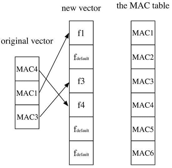 - The first step is to align RSS fingerprint vectors to the same length. Assuming that there are N collected fingerprints, and they can be represented from to respectively. In the collected fingerprints, to may have different length and each of the vector element may represent RSS values from different APs. From Equation (6), the union set of all RSS fingerprint is acquired. The function returns the set of MAC of the fingerprints. Then according to the set , a table is established, where each index in the table corresponds to a specific MAC from an AP. Then according to the table, we align all the fingerprints shown in Figure 6. If a specific MAC in the original RSS vector is missing, then we fill the corresponding index with the value . This value is assumed to be the noise level denoting that the signal from the AP is buried in noise. Herein the default value in our implementation is −110 dBm, which is also adopted in Reference []. After the processing, all the fingerprints now have the same length and can be adopted as the input to the neural network model.