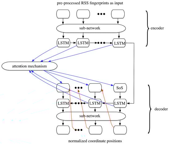 - As both the input (pre-processed RSS fingerprints) and the output (the normalized coordinate positions) can present the corresponding metrics in their own forms, so no processes like word embedding are needed. However, in the encoder, before the normalized RSS fingerprint is input to the LSTM cells, a function or a small CNN network is added, which can downsize the dimension to input to the LSTM and makes our model easier to train. Noting that here the sub network shares the same weights for different RNN epochs in the encoder. This is the same for the sub network in the decoder.