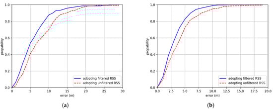 The Cumulative Density Function (CDF) comparison between adopting filtered RSS and unfiltered RSS in (a) Building One and (b) Building Two.
