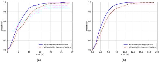 The effects of the attention mechanism is shown in Figure 12. We can see that adding attention mechanism can significantly increase the positioning performance in both Building One and Building Two. The positioning accuracy has increased by about 2.01 m and 1.13 m in Building One and Building Two.