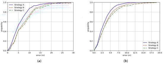 Note that here, the results of no dataset enhancement are not shown. The reason is that we found the neural network cannot reach convergence without any form of dataset enhancement. From Figure 13, we can see that the strategy A has the best performance. Table 1 gives the summary of how the mentioned processes can enhance the performance of the proposed method. We can see that these processes are very effective in increasing the positioning accuracy, especially the proposed dataset enhancement strategy, which can make the neural network to converge in training. Noting that in the results of Figure 12 and Figure 13, we have adopted our proposed data enhancement Strategy A for the rest of the experiments, that is, including trajectory cutting, inverting and aggregating.