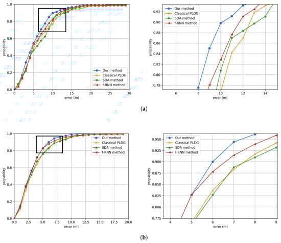 The CDF comparisons between the proposed method, the classical PLGD method, the SDA method and the f-RNN method in (a) Building One and (b) Building Two. Noting that here we enlarge the partial CDF for clarifying.