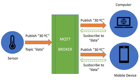 An example of a message’s flow for MQTT is shown in Figure 4. In this particular case, a temperature sensor (publisher) is sending the temperature using the topic data to the MQTT broker. The MQTT broker delivers the topic messages to the two subscribers (computer and mobile device), which previously registered their interest in the data topic.