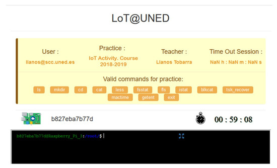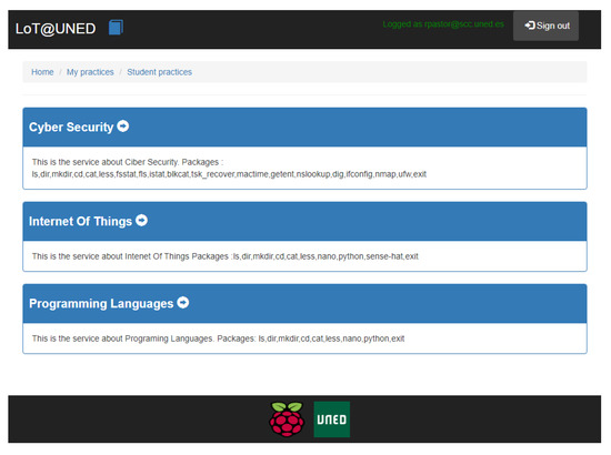 - Initial web portal for students/teachers [57]. This website portal allows user authentication and access to the different practices available to the student, grouped by area of knowledge (see Figure 6). In addition, in the case of the teacher role, practices can be created from predefined execution services, adding the appropriate learning resources (statement of practice). Under the teacher role, work session options can also be configured (duration, commands to be executed on the IoT device, etc.). The access portal also allows verifying and analyzing the work sessions in the different practices, intending to evaluate the students.