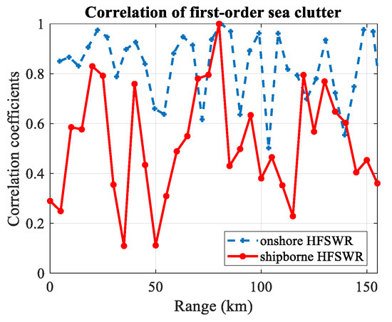 The correlation coefficients between the CUT and other range bins are shown in Figure 6. The solid line marked with a circle sign represents for the shipborne HFSWR and the dashed line marked with a plus sign shows the correlation in onshore HFSWR. The reference range bin is at 80 km. We can see that the correlation coefficients in onshore HFSWR are almost above 0.6, while the correlation coefficients in shipborne HFSWR are much lower and irregularly distributed. This result clearly proves that the first-order sea clutter is not homogeneous in range dimension.