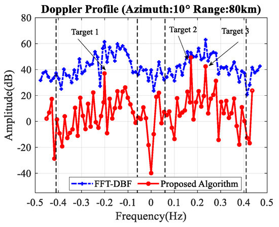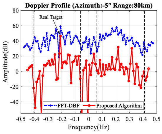 The Doppler profile is shown in Figure 10 when the range and beam are set to the target. The dash-dotted line represents the initial data without clutter-suppression while the solid line represents the final result. The vertical dashed lines show the theoretical broadening area of the first-order sea clutter. As illustrated in Table 3, the SCNR improvement reaches 24.9 dB and the target can be easily detected after clutter-suppression.