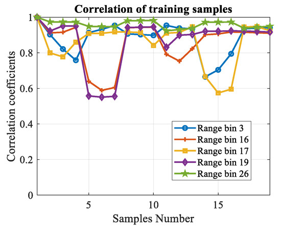 As mentioned above, the unscented transformation is conducted on the primary data first. To prove the validity of the generated secondary samples, the correlation coefficients are calculated using the azimuth–Doppler joint eigenvectors analysis method listed in Section 3.3. Some of the range bins are chosen randomly to show the result. In our experiment, 32 range bins are used totally, and the local processing region is . For each range bin, the unscented transformation is conducted and training samples can be obtained. Figure 7 illustrates the correlation coefficients of the training samples produced from the primary data. Each line represents for one range bin. It can be seen that almost all of the coefficients are above 0.6, which means the produced training samples are homogeneous.