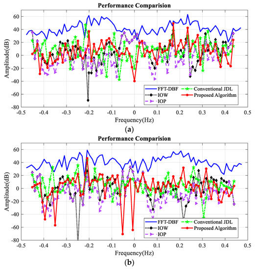 Figure 11 gives the comparison between the conventional clutter-suppression algorithms and the proposed algorithm (fast Fourier transform and digital beamforming (FFT–DBF), improved orthogonal weighting [26], improved oblique projecting [27], conventional JDL [24], and proposed algorithm) with three simulated targets and one real target, respectively.
