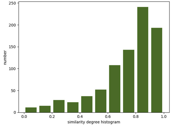 For the existing GCN-based [20] traffic volume prediction methods, graphs are directly constructed according to the topology of the road networks. This type of construction is more suitable to the prediction of traffic speed because the speed of vehicles on adjacent roads is usually highly correlated [8]. In an urban road network, the disjointed road sections with similar traffic functions such as main roads near transportation junctions or business zones usually have similar traffic flow patterns [9]. As shown in Figure 1, we divided a day into 288 time slots, with each time slot taking 5 min. Figure 1 shows two sequences of taxi departure flows for two functionally similar roads, road 191 and road 444 in the city of Xi’an. Both roads were located near schools, and these two schools had the same schedule. It can be seen that the roads had similar taxi demand patterns, and the similarity that was calculated according to Equation (2) was greater than 0.891. In addition, we found that the same road section showed certain similarities for departure and arrival flow patterns in different time slots, which meant that the prediction tasks for departure and arrival flows could be regarded as two correlated tasks. As shown in Figure 2, we divided the similarity range (interval [0,1]) into bins. The width of each bin was 0.1. The height of each bin indicated the number of road sections that had the same range of similarity, calculated according to Equation (2). ε was set as 0. As also shown in Figure 2, for most road sections, the similarity between the departure and arrival flows was greater than 0.6, which meant that to a certain extent, there was a correlation between the departure and arrival demands in most city road sections. This gave us an opportunity to incorporate multitask learning to jointly forecast departure and arrival flows. Through parameter sharing, multitask learning allows deep neural networks to learn more general features, which greatly reduces the risk of overfitting and enables the model to have better generality [21]. However, most existing methods do not take this correlation into account.