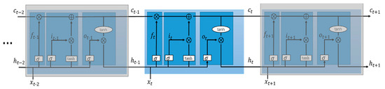 As is known, recurrent neural networks such as RNN and LSTM are capable of extracting temporal features from time sequences. Compared with RNN, LSTM can capture dependencies between long-term items and avoid the gradient-vanishing problem by importing a gate mechanism. In our model, a multilayer LSTM was used to extract the temporal features hiding in the traffic flow sequences. The architecture of the LSTM is shown in Figure 5. A basic LSTM unit was mainly composed of three gates and one memory unit. The three gates were the input gate, forget gate, and output gate, whose outputs could be represented as follows: