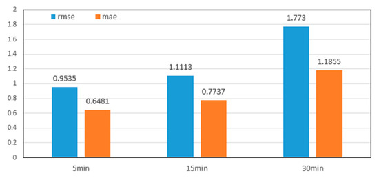 As described in this section, we divided the time slots into different lengths. We used the MGLN Prediction Network to predict the travel flow to verify the stability of the network. As shown in Figure 8, the time slot lengths we adopted were 5, 15, and 30 min. As the time slot length increased, the prediction error also increased by a small range, which indicated that the proposed method was more applicable to predict taxi demands on a smaller scale in terms of the time granularity.