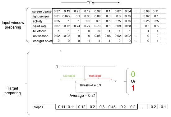 First, at the “ìnput window preparing” stage, seven time-series (sensors data) are concatenated. Next, eight samples (as an example) of each sensor data are selected as the input for our model. The average of eight corresponding slopes are calculated. Next, for quantization, we use a hard-limit transfer function [], with zero for low slopes (green) and one for high slopes (red) with a border of (0.3).