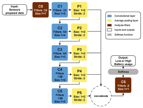 Structure of the fully convolutional neural network (FCNN) model for battery consumption analysis. Convolutional layers are marked with “C” and pooling layers are marked with “P”. Two convolutional layers (C0, C6) are specialized in filtering for analysis. The outputs of the pooling layer are concatenated and fed into the sixth convolution layer to prepare data for softmax function classification.