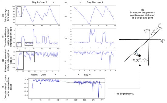 In the second step, we create another time series (see Figure 3c), which removes the charging signals (positive slopes) and only keeps the discharging signals from the time series generated in Figure 3b. In the fourth step, we concatenate all generated signals from Figure 3b, in temporal order, together. The result is shown in Figure 3d, and so each user will end up having one time series of connected slopes. In the fifth step, we use piecewise aggregate approximation (PAA) [] to transform the new signal into two numeric scalars (,). In other words, the output of PAA will be the coordinate of the final data point in the scatterplot, as shown in Figure 3e. In particular, one point presets the first () and the other point presents the second half () of battery life for each user (u).