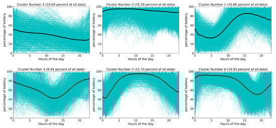 Result of the k-means clustering. These plots present the average percentage of battery drain based on the hours of a day. Cyan is used to show time series in the same cluster, and black curves show the center of each cluster.