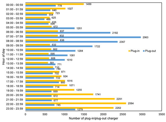 Figure 5 presents the number of plug-ins and unpluggings based on the time of the day. This figure shows that users unplug and plug-in more often between 6:00–9:00 a.m. and 9:00–11:59 p.m. than other hours of the day; Figure 5 shows the most frequent charging time.
