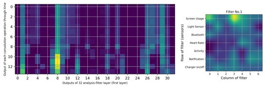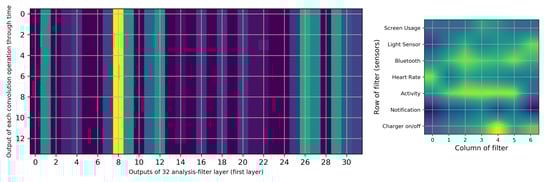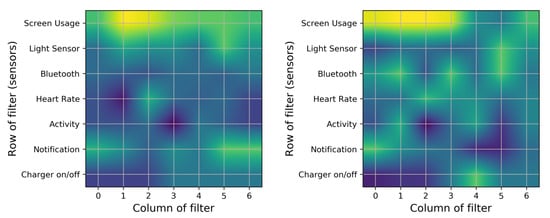 The smartwatch market is expected to grow to $22 billion by 2022. The growth rate of smartwatches has shown the highest increase compared with smartphones, tablets, and laptop ownership, which illustrates the uptake of the smartwatch and penetration of these devices into daily life []. A more detailed understanding of smartwatch battery usage could help developers, manufacturers and researchers to design or change their software and hardware for optimal battery utilization. We believe it is therefore necessary to analyze the use of smartwatches in the real world, including different brands and the use of a diverse group of users to gain a holistic overview of their usage. Although promising initial research has been carried out in this field, further research is still required to investigate the significant challenges of this area [,,,,]. In particular, research into human–computer interaction (HCI) is a challenge when research goes beyond the laboratory and is carried out in the real world []. One issue is that human behavior is multifaceted and complicated, and so more complex models are required to analyze collected data [,]. As such, as the complexity of the model increases, our control and accessibility to the model and its functionality decreases []. Another challenge is that smartwatches are equipped with low-cost sensors and thus are prone to missing data and artifacts [], which makes it more difficult to accurately model user behavior. In this paper, we mitigate these challenges with Algorithm A1 for the alignment of sensor data with our deep learning model, which is capable of further exploring the inputs of the model using its first layer filters.