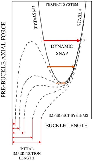 Imperfection sensitivity of equilibrium paths (adapted from Hobbs [2]): the transition from mechanical instability to stability happens at lower forces and less dramatically in the presence of an initial crookedness, to be eventually replaced by a progressive enlargement of the imperfection.