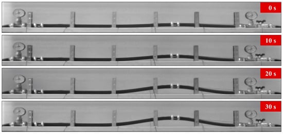 A video camera recorded the whole experiment: temperature was raised from 23.8 (room temperature) to 35.4 °C and buckling took place. A pre-existing bend in the tube was exploited to “catalyze” the process; this is evident in the 0-s frame in Figure 4, meanwhile the frames recorded at 10, 20 and 30 s reveal the magnitude of the buckling phenomenon due to temperature effects.