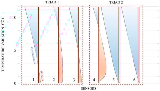 Temperature rise vs. longitudinal strain, where the longitudinal strain is placed on the horizontal axis; Triad 1 (sensors 1–3) registered an increment in tension (positive, highlighted in red), whereas Triad 2 recorded concurrent expansion in the upper portion of the tube (sensor 4) and contraction (negative, highlighted in blue) in the lower one (sensors 5–6).
