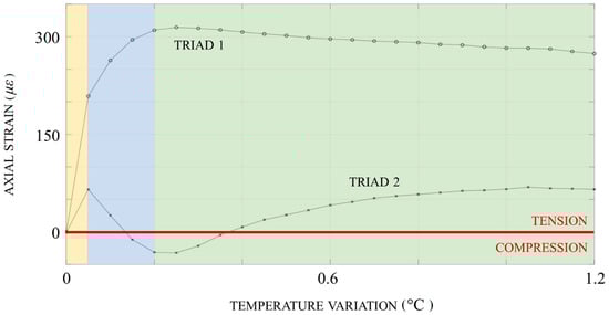 Axial strain vs. temperature rise: tension, encountered in the inceptive stage (yellow area), was gradually counterbalanced by the reaction of the constraint at the outlet, perceived first by Triad 2, undergoing sudden compression (blue area), which was subsequently released (green area).