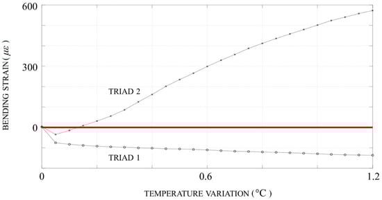 To facilitate their reading, data are presented as “wiggle traces” (i.e., lines oscillating about a null point: a common method of displaying seismic information, for instance). The traces ultimately become uninterpretable parallel lines on account of temperature compensation (Section 2.2), carried out by subtracting from the measured longitudinal strain the apparent thermal one, defined as: