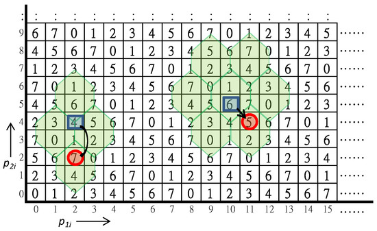 By leveraging the periodic property of the maze matrix, we modulated a reference element to the fundamental period of , . Then, the fundamental period was further divided into four reflective symmetric parts. According to the secret digit to be embedded, a quasi-target element can be obtained. By reflection and backward modulation, the target element can be determined. The detailed algorithm is summarized as follows.