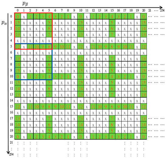 The maze matrix was constructed using a basic structure matrix of size as enclosed by the red square shown in Figure 2. Distinct numbers in the radix-16 number system were arranged by circulating the outmost boundary of the region except for a horizontal and a vertical gap. Other elements were marked with ‘x’. By repeated mirroring operations, the rest of a maze matrix was constructed. The first mirror matrix of the red basic structure to the direction of axis was enclosed by a blue square in the figure. The resulting matrix looks like a big maze map and was named the maze matrix.