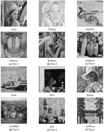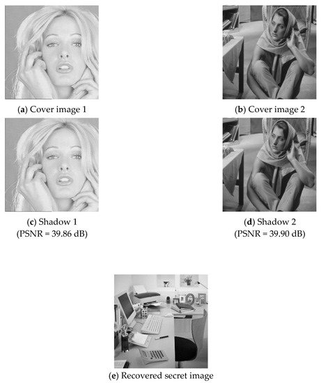 Now, we apply the embedding results in the previous subsection and as examples. For the first shadow pixel pair, the secret digit can be retrieved by directly calculating Equation (27), i.e., . For the second pixel pair, the pixels should be swapped according to Equation (26), i.e., . Then, calculate Equation (27),, i.e., . Both secret digits coincided with the embedded ones.