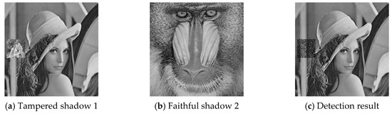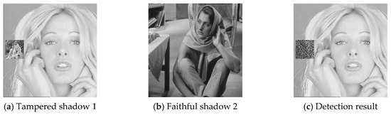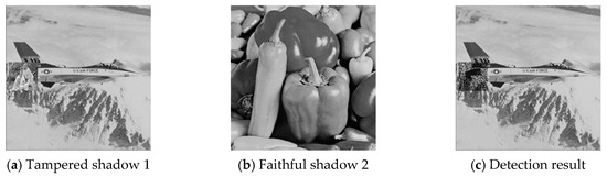 The six pairs of image shadows were then applied to test the cheating detection mechanism. In each pair of shadows, shadow 1 was tampered by inserting a small image into a local region while shadow 2 was kept faithful. Four results of the six experiments are provided in Figure 7, Figure 8, Figure 9 and Figure 10, where (a) is the tampered shadow image 1, (b) is the faithful shadow image 2, and (c) is the result of joint detection. The detected cheat pixel pairs are illustrated by black pixels on the tampered shadow. The joint cheat detection ratio for the six test shadow pairs are listed in Table 3. In each test pair, the detection ratio was calculated by